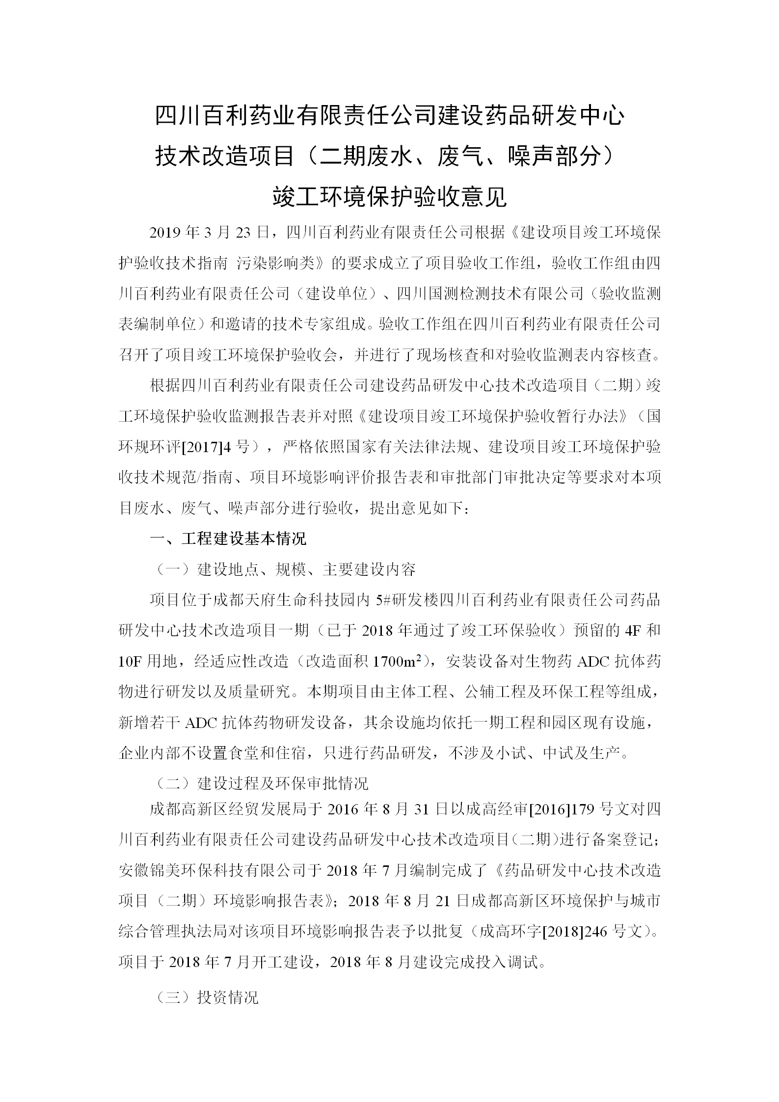 根据《国务院关于建设项目竣工环境保护管理条例的决定》以及环保部《建设项目竣工环境保护验收暂行办法》的公告(国环规环评[2017]4号)现将《四川NG体育·(中国区)官方网站-NG SPORTS有限责任公司药品研发中心技术改造项目(二期)竣工环保验收监测报告》及验收意见公示如下: